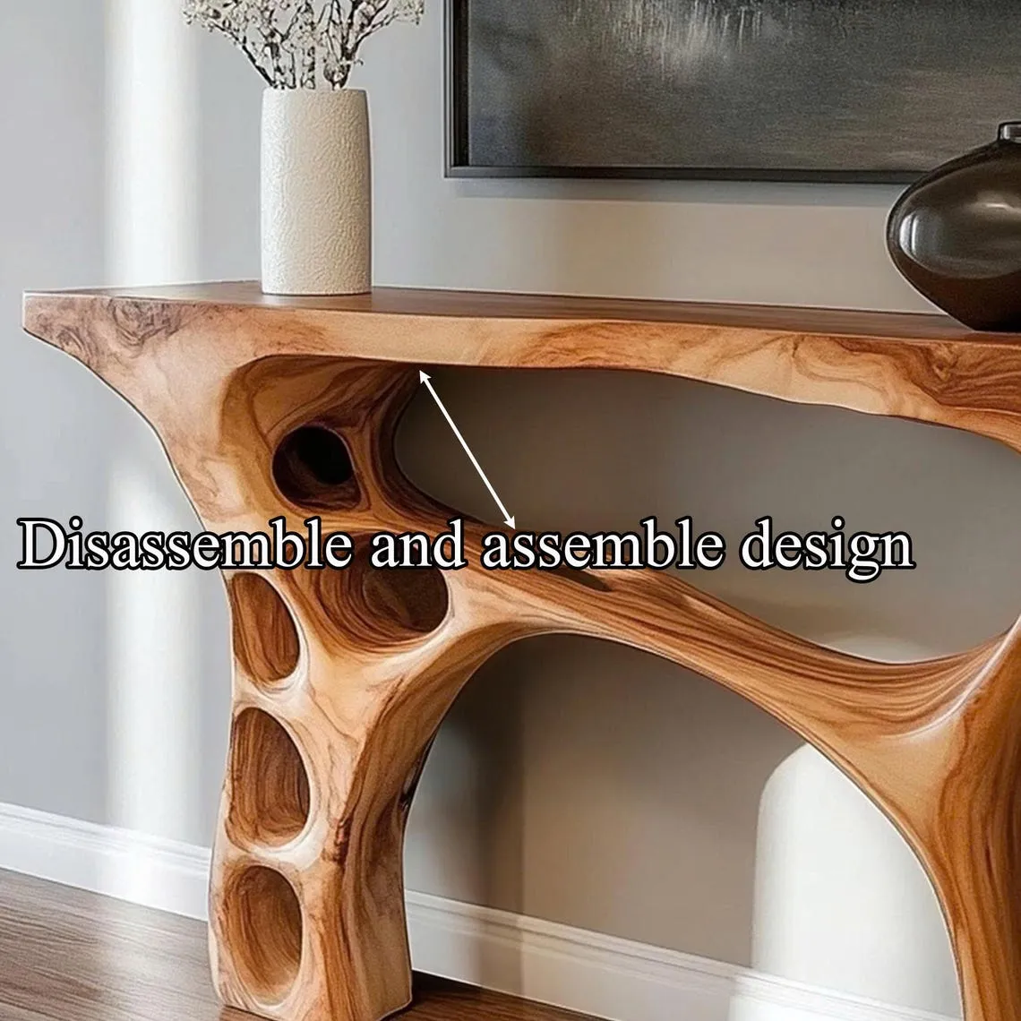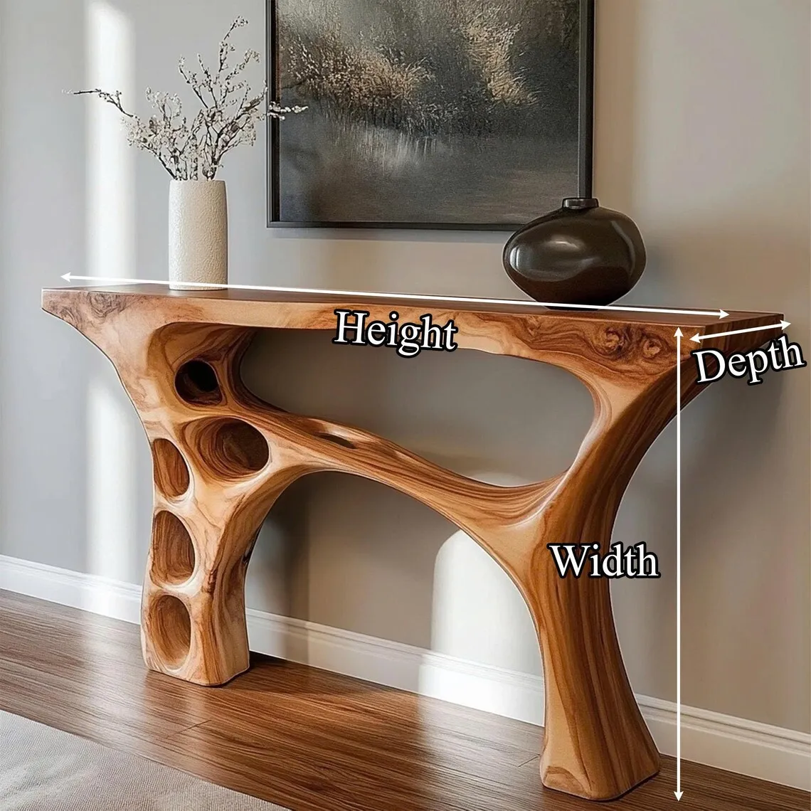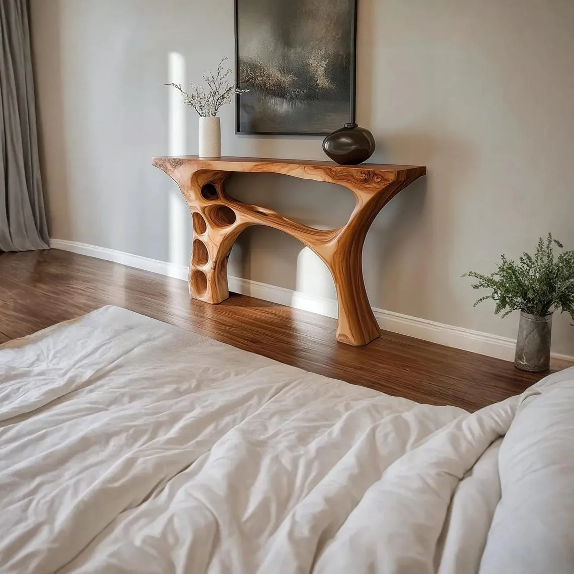 A sculptural console that brings organic movement to the entryway. The Driftline silhouette is carved to follow the flow of the grain, creating a quiet statement that feels both modern and natural. We shape the top for comfortable touch, soften the edges, and support it with a stable base that keeps the hallway open and easy to navigate.